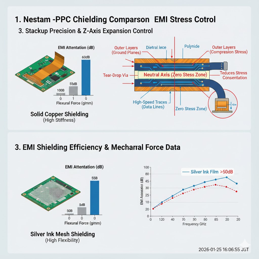 Per mantenere la flessibilità, utilizziamo Schermatura a rete in inchiostro d'argento, fornendo Attenuazione >50 dB a 10 GHz riducendo al contempo la forza meccanica di "ritorno elastico" 45% rispetto ai piani in rame massiccio.